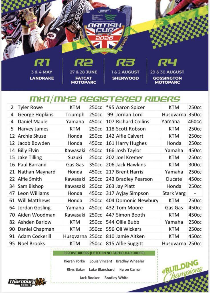 MX1 & MX2 Rider List – NORA92 British Cup dirtbikenewseditor January 9, 2026 in NORA 92 British Cup, NORA Motorsport - 0 Minutes The organisers of the NORA92 British Cup have released the MX1 & MX2 rider list for the 2026 Championship.